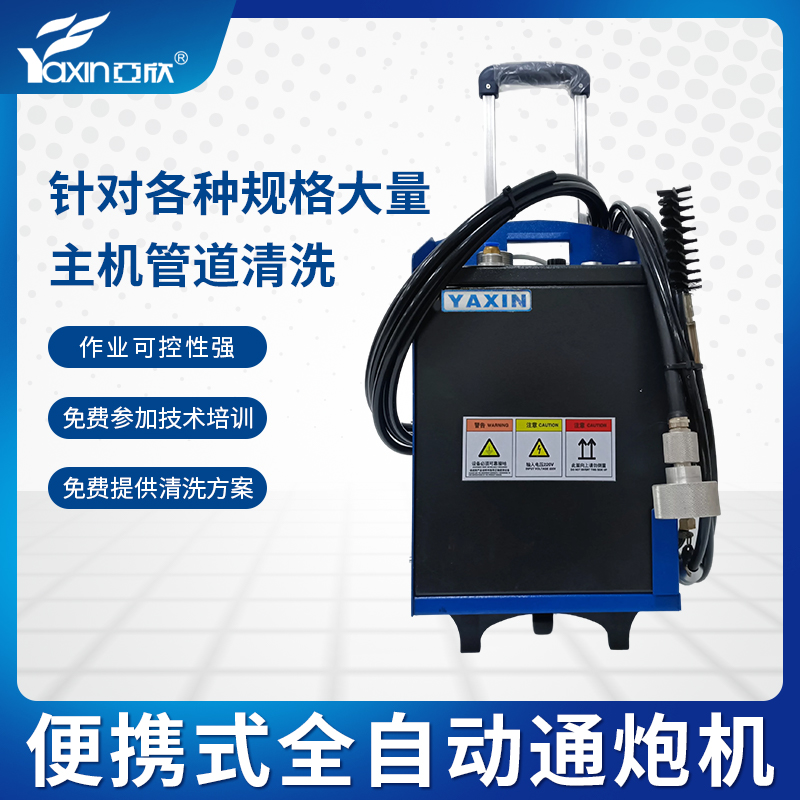 亞欣便攜式通炮機主要用于主機銅管通炮,操作便捷、性能穩定、作業可控性強,滑輪、可伸縮拉桿、自吸式進水等功能設計,使用更方便,針對各種規格大量主機管道清洗效率極高;本產品可用來做小型管道(管徑14-28MM)內部的清洗,主要是用于中央空調主機銅管的清潔工作